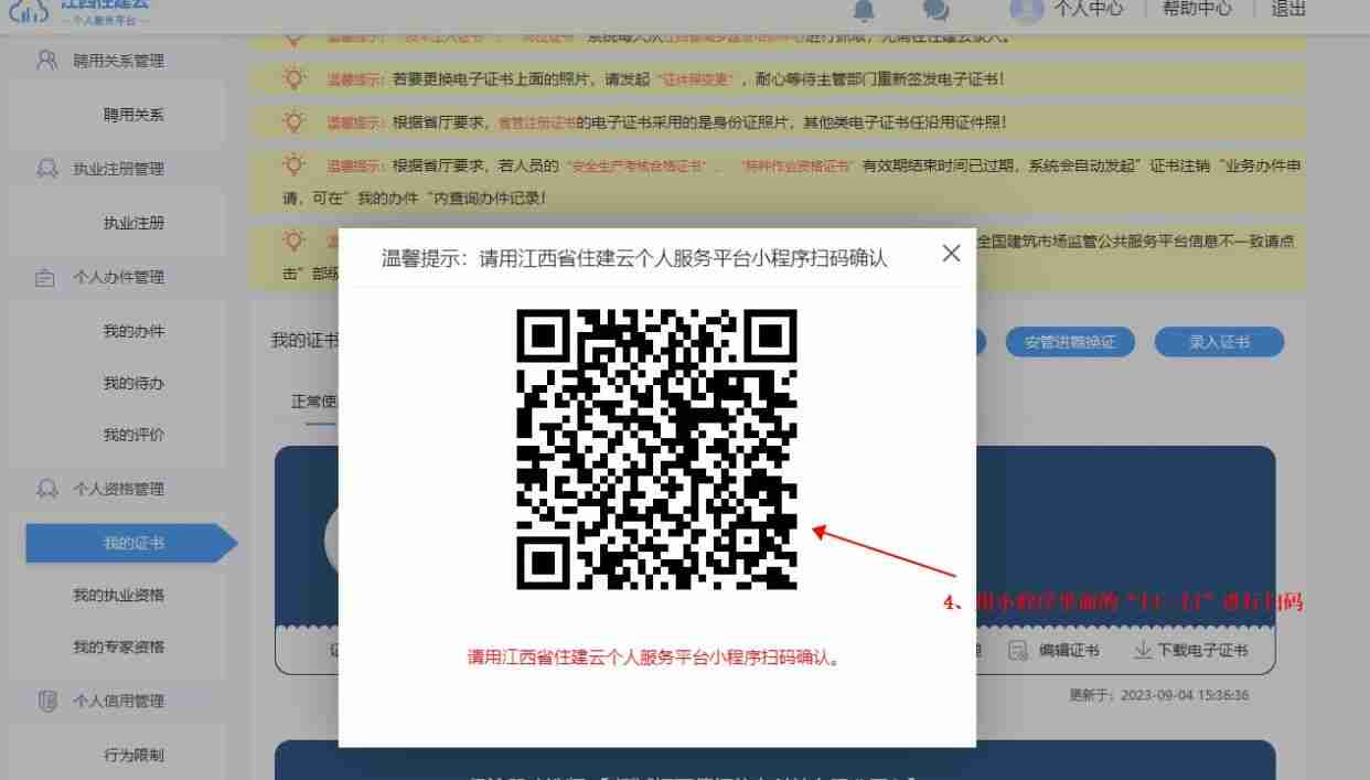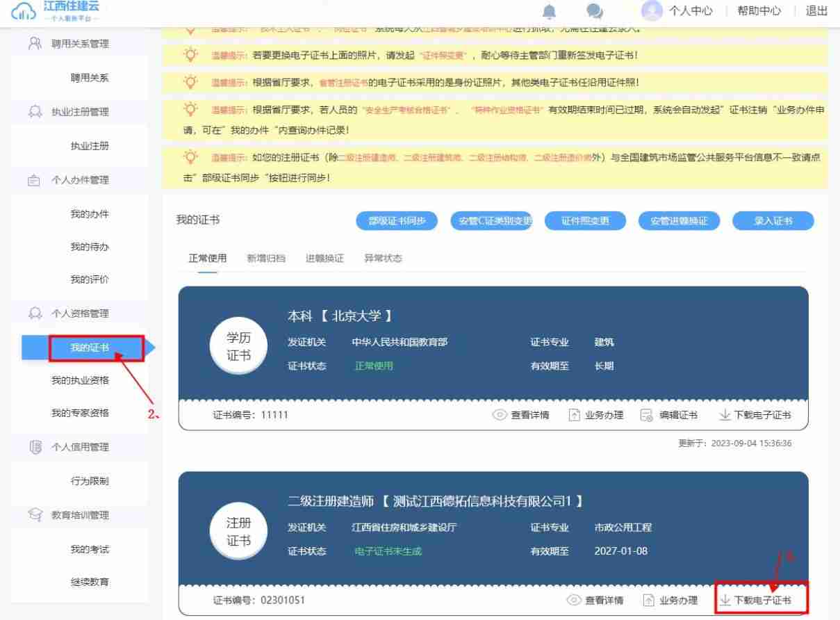 人員登錄【江西住建云】個人服務(wù)平臺,在【我的證書】模塊內(nèi),找到二級注冊建造師電子證書。下載證書的操作流程如:點(diǎn)擊【下載電子證書】按鈕,通過微信小程序掃碼認(rèn)證后,點(diǎn)擊【證書加注】。待證書加注成功后,即可下載電子證書。