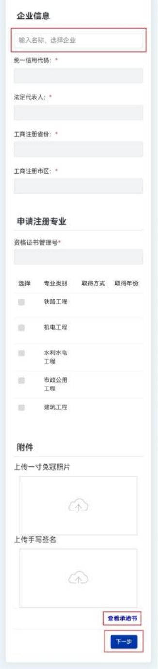 第二步:在“聘用企業(yè)信息”欄目中的企業(yè)名稱輸入框中輸入所受聘企業(yè)的名稱關(guān)鍵字(圖9-2),在該輸入框下會提示可選的企業(yè),點(diǎn)擊所受聘的企業(yè)名稱,系統(tǒng)自動提取該企業(yè)的統(tǒng)一信用代碼、法定代表人、工商注冊省份、工商注冊市區(qū);(注:若輸入框下未提示聘用企業(yè)的名稱或系統(tǒng)未提取出該企業(yè)的信息,說明企業(yè)名稱輸入錯(cuò)誤或該企業(yè)還未在“建設(shè)行業(yè)執(zhí)業(yè)資格管理信息系統(tǒng)”(點(diǎn)擊進(jìn)入)完成注冊和實(shí)名認(rèn)證)