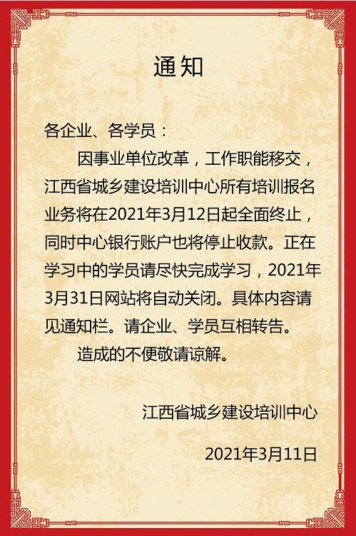 因事業(yè)單位改革,工作職能移交,江西省城鄉(xiāng)建設(shè)培訓(xùn)中心所有培訓(xùn)報(bào)名業(yè)務(wù)將在2021年3月12日起全面終止,同時(shí)中心銀行賬戶也將停止收款。正在學(xué)習(xí)中的學(xué)員請盡快完成學(xué)習(xí),2021年3月31日網(wǎng)站將自動(dòng)關(guān)閉。具體內(nèi)容請見通知欄。請企業(yè)、學(xué)員互相轉(zhuǎn)告。