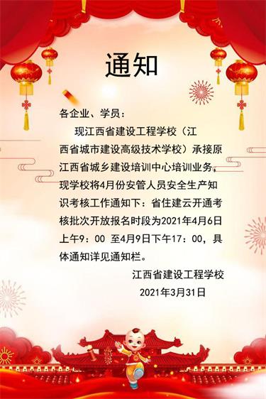 現(xiàn)江西省建設(shè)工程學(xué)校(江西省城市建設(shè)高級技術(shù)學(xué)校)承接原江西省城鄉(xiāng)建設(shè)培訓(xùn)中心培訓(xùn)業(yè)務(wù),現(xiàn)學(xué)校將4月份安管人員安全生產(chǎn)知識考核工作通知下:省住建云開通考核批次開放報名時段為2021年4月6日上午9:00至4月9日下午17:00,具體通知詳見通知欄。