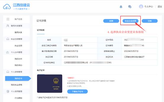 當執(zhí)證人員因單位調(diào)動,需要辦理證書變更業(yè)務時,在“證書詳情”頁面,點擊“執(zhí)業(yè)企業(yè)變更”,系統(tǒng)自動檢測本人實名制認證、上傳證件照、聘用關系登記、無在辦理業(yè)務等條件,各項條件滿足,申請單由證書所在單位確認后才會提交至相關業(yè)務部門審查,審查完成后簽發(fā)電子證書,實現(xiàn)“一次不用跑”。操作流程:【我的證書】→【異常狀態(tài)】→【業(yè)務辦理】→【執(zhí)業(yè)企業(yè)變更】→【證書所在單位確認】→【業(yè)務提交至主管部門審核】,如下圖: